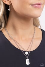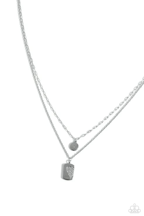 Dotted with a single white rhinestone, a shiny silver disc glistens at the bottom of a dainty silver link chain. Featuring a white rhinestone-embossed half-heart motif, a rectangular silver pendant glides along a dainty classic silver chain, resulting in subtly romantic layers below the collar. Features an adjustable clasp closure.